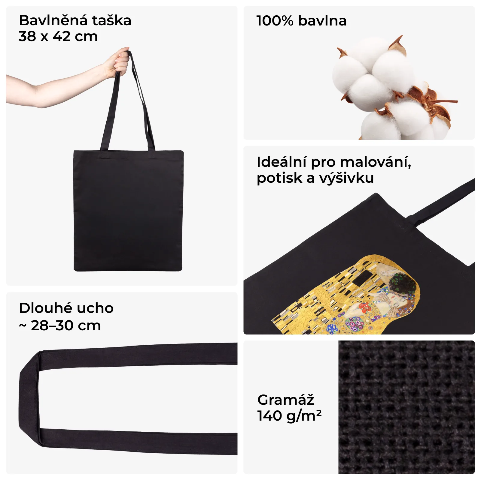 Černá bavlněná taška velkých rozměrů 38 x 42 cm z bavlněné tkaniny o hmotnosti 140 g. Tato eko-taška má praktické dlouhé ucha. Naše bavlněné tašky jsou baleny jednotlivě, nabídka se týká 1 kusu.