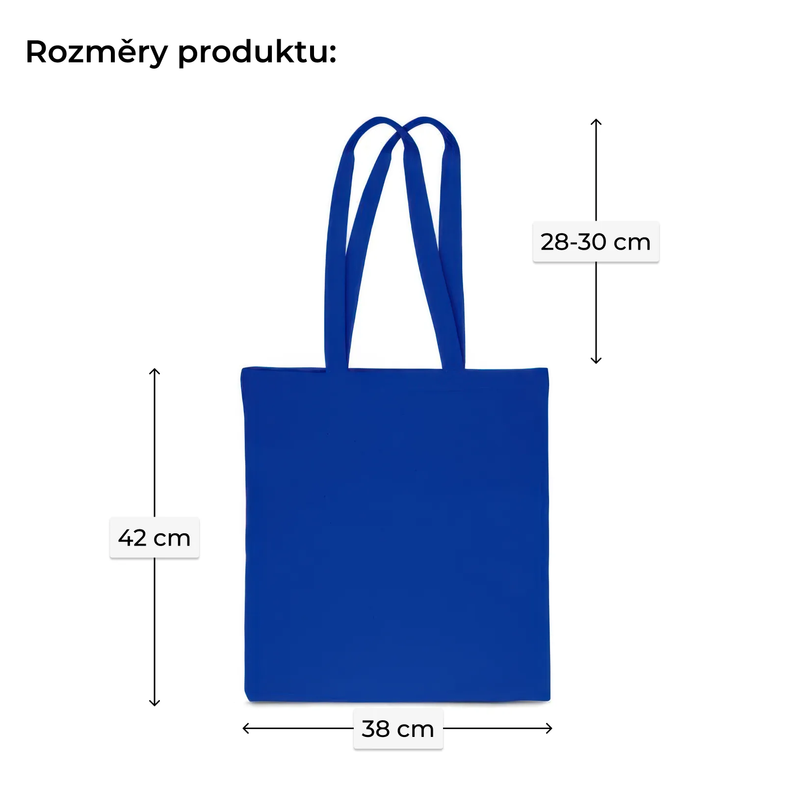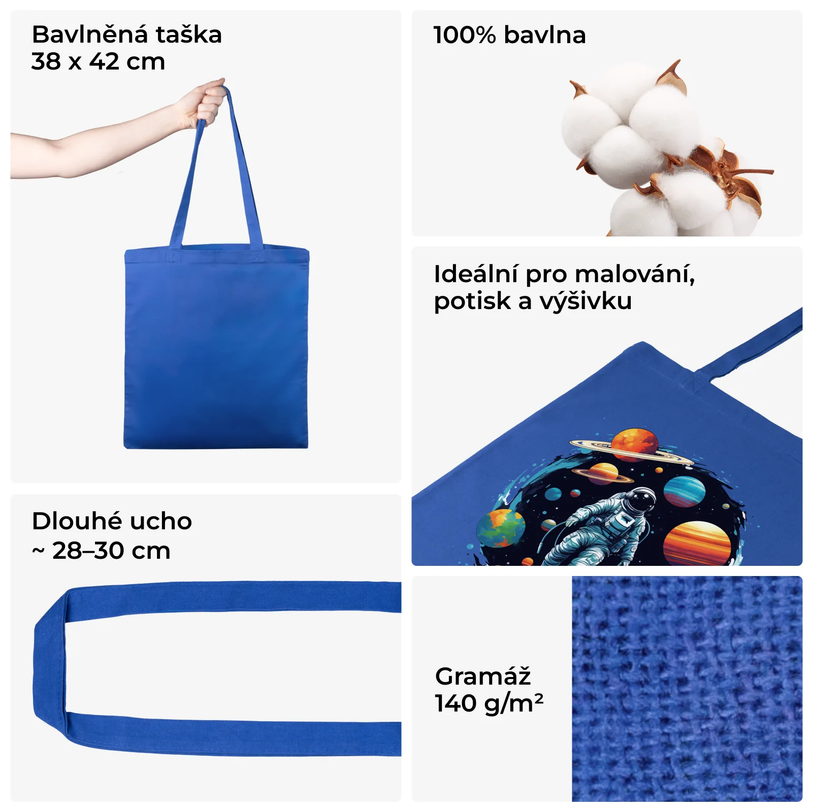 Prezentovaná bavlněná taška je ušita z hladké, pevné látky v módní modré barvě. Je dostupná ve velikosti 38 x 42 cm, ušitá ze 100% bavlny o hmotnosti 140 g. Nabízená bavlněná eko-taška má dlouhé ucha. Zakoupením 1 balení obdržíte 1 kus eko-tašky z bavlny.
