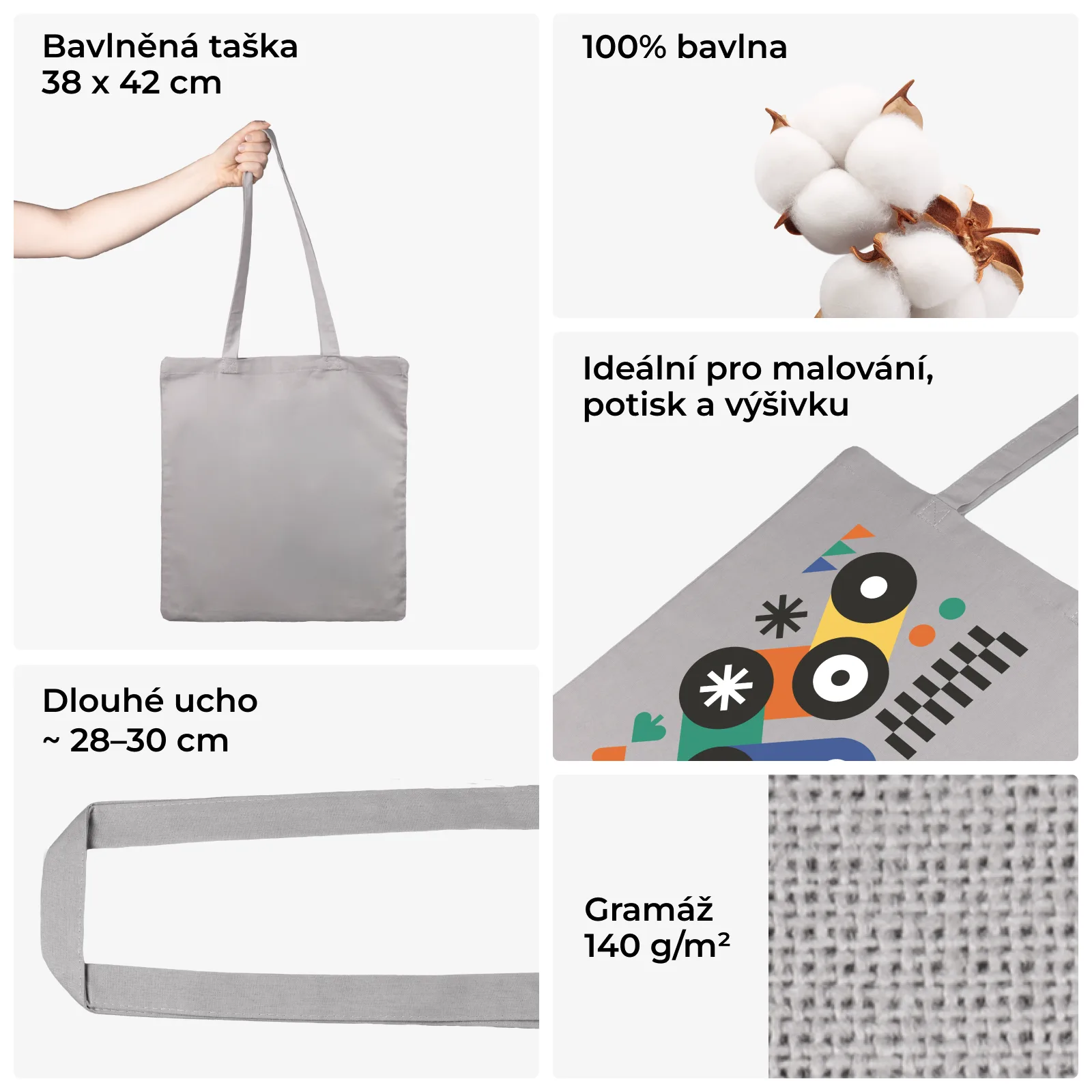 Bavlněná taška ve větším rozměru 38 x 42 cm a hmotnosti 140 g. Tato eko taška je vyrobena z bavlny a má dlouhé ucha. V prezentované nabídce objednáte 1 kus produktu.