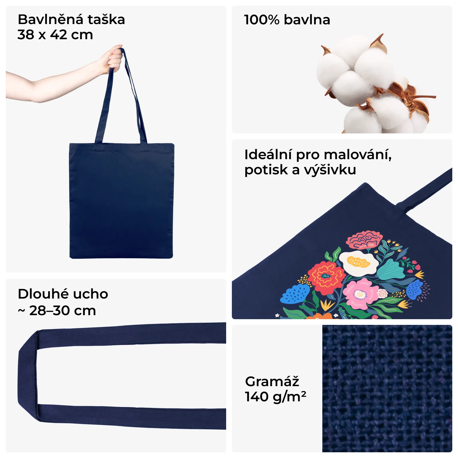 Velká bavlněná taška o rozměrech 38 x 42 cm a hmotnosti 140 g v módní tmavě modré barvě. Tato eko taška je vyrobena z bavlny a má dlouhé ucha. Cena je uvedena za 1 kus, tašky balíme jednotlivě.