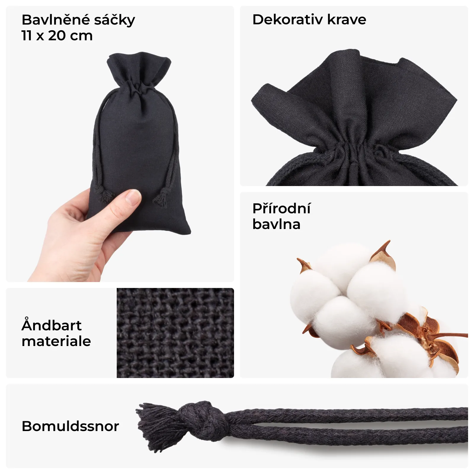 Přemýšlíte, k čemu využít černé bavlněné pytlíčky? Tato sada malých pytlíčků z černé bavlny vám umožní krásně zabalit dárky, ale můžete ji využít také k vytvoření domácích dekorací nebo jako produktový obal (na šperky, kosmetiku, pytlíček na ručně vyráběné vonné svíčky).