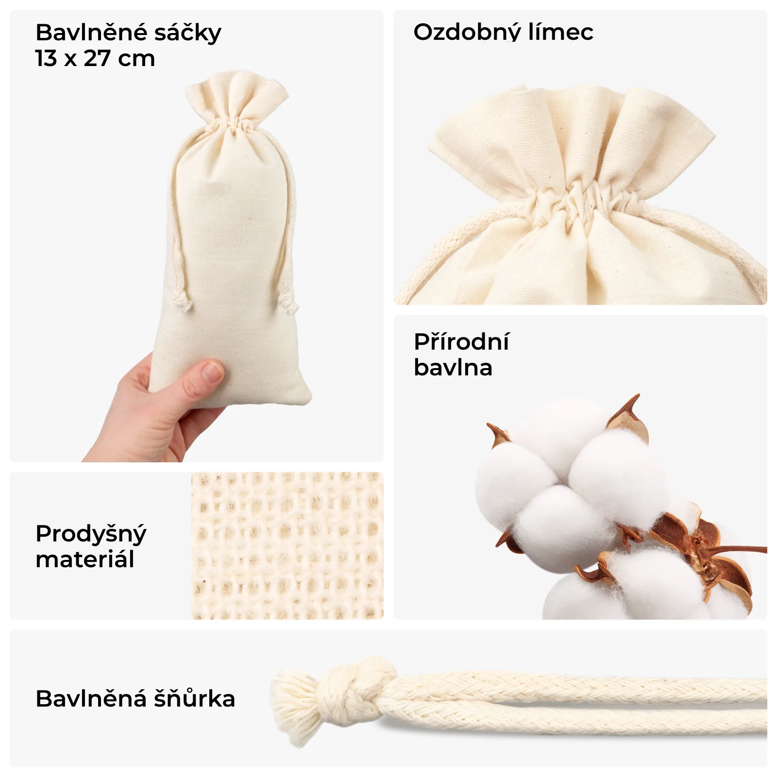 Je to sada 10 kusů sáčků z originálního materiálu typu bavlna o rozměrech 13 x 27 cm, jejichž přirozená barva bude ideální pro téměř každou situaci. Sada, kterou nabízíme, je univerzální, protože Vám umožňuje používat sáčky mnoha způsoby v závislosti na situaci.