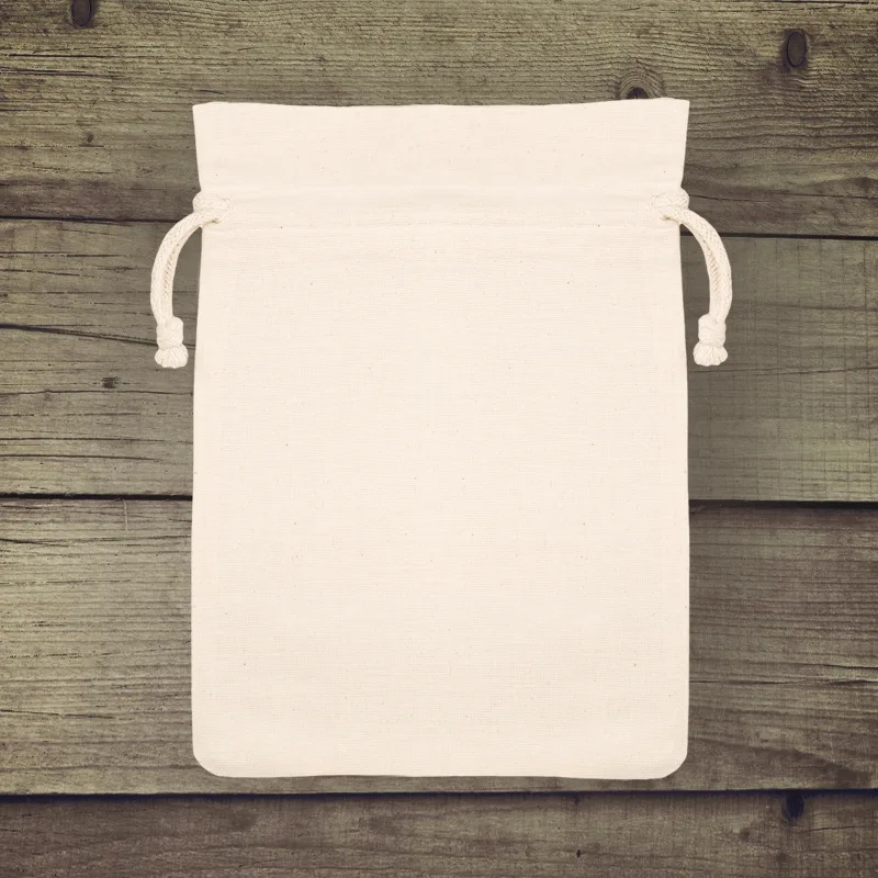 Odolný a praktický bavlněný pytel o rozměrech 26 x 35 cm, sešněrován přírodním šňůrkou.