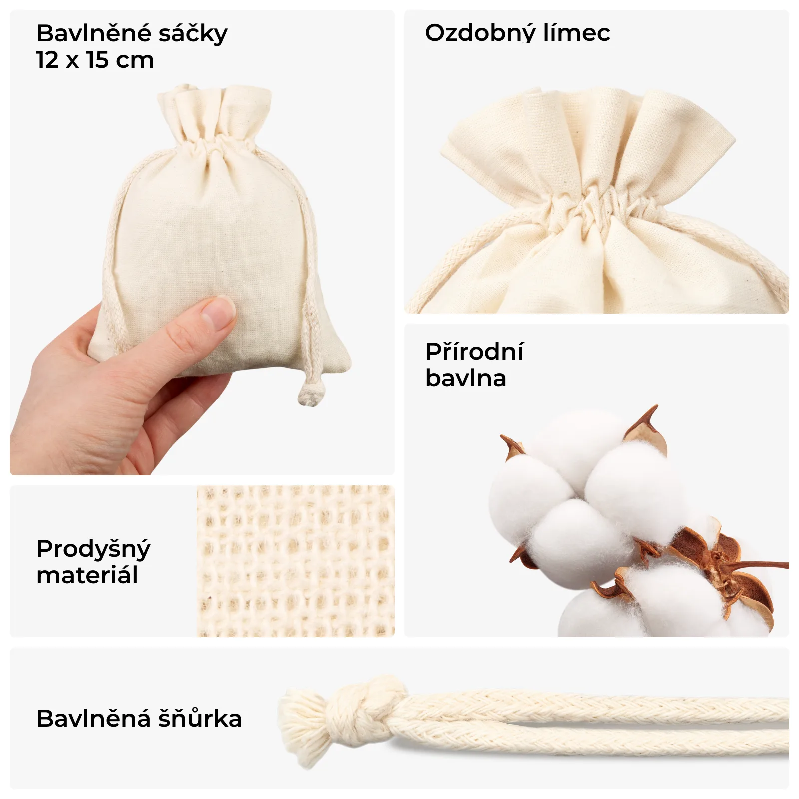 Sáčky jsou ušité ze 100% přírodní bavlny, díky čemuž jsou pevné, trvanlivé a zároveň příjemné na pohled i na dotek.