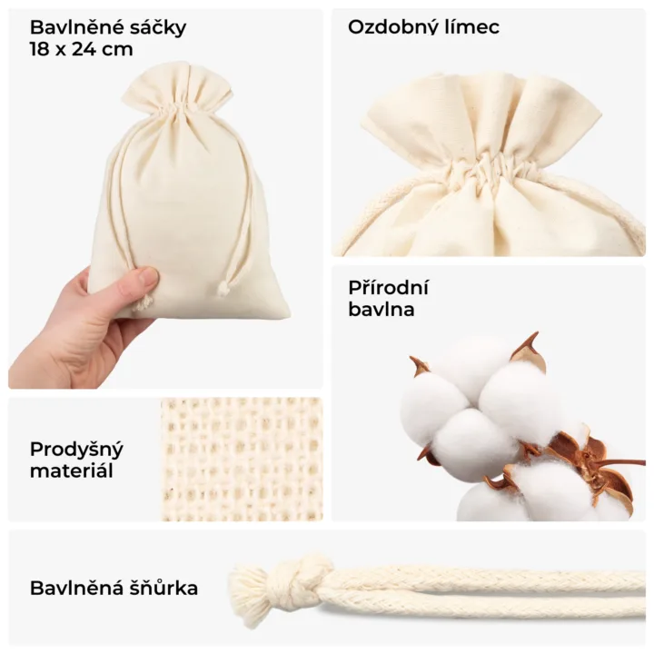 Sáčky jsou vyrobeny z přírodní bavlny, která zajišťuje jejich odolnost a šetrnost k životnímu prostředí.