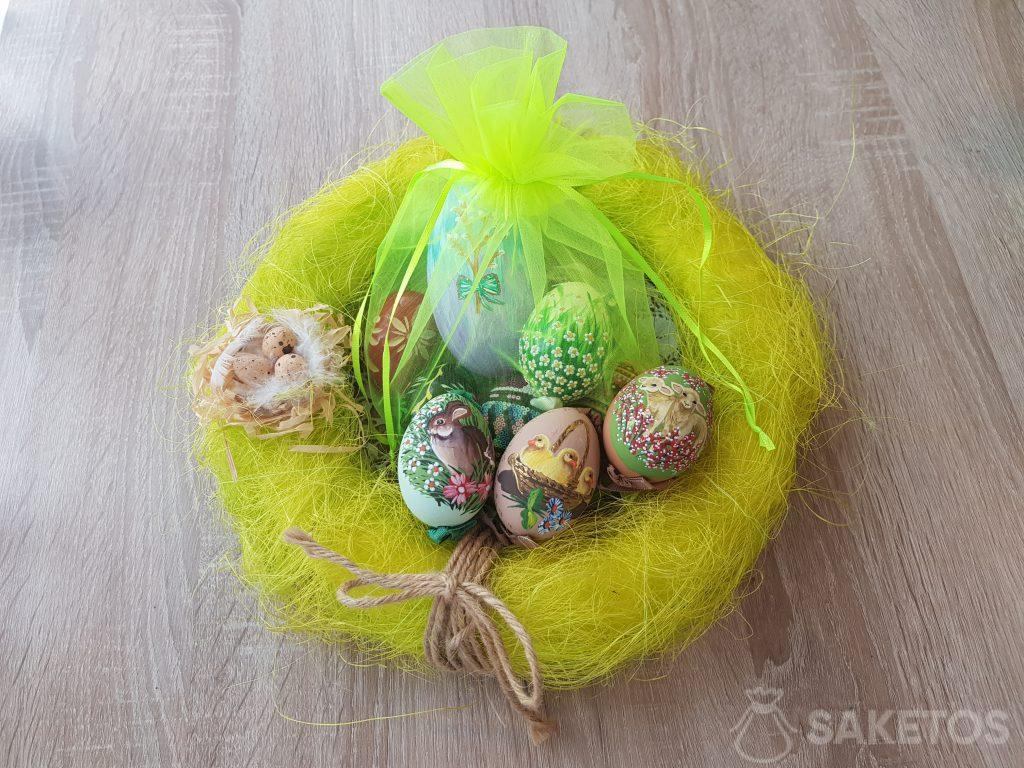 Ručně malované velikonoční vajíčka v neonově zelených organzových sáčcích. Příprava je jednoduchá a současně je to skvělá dekorace. Spodní strana průhledného organzového sáčku by měla být obložena senem (nebo vložte do sáčku hnízdo z tkané slámy nebo tyčinek) a měla by obsahovat aj slavnostní velikonoční vajíčko nebo několik menších vajec (můžete si vybrat tradiční velikonoční vajíčko nebo do hnízda umístit čokoládová vajíčka).