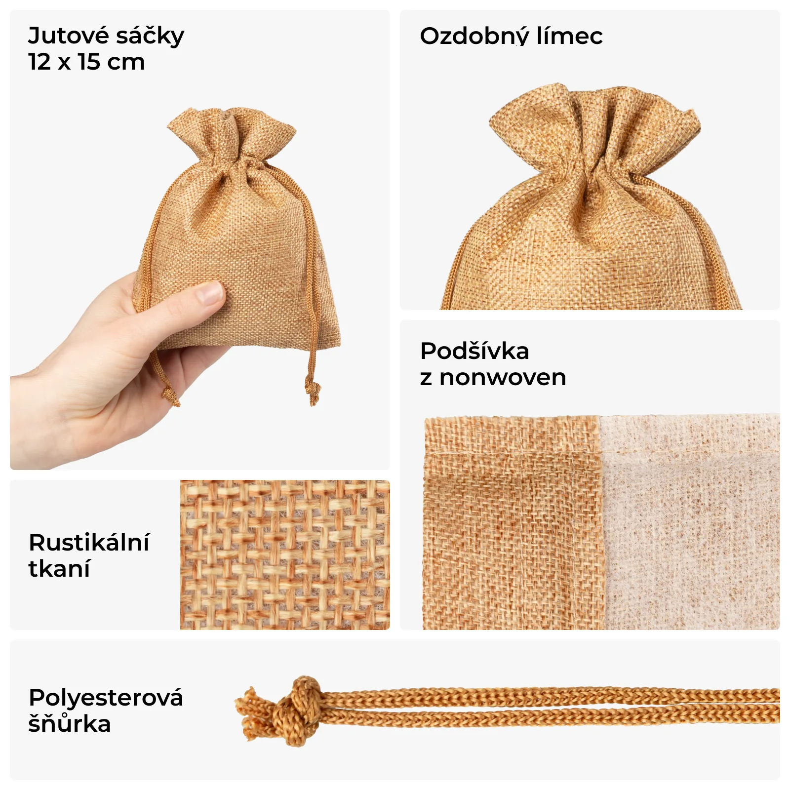 Doporučujeme také jutové sáčky jako dárkové balení, zejména ty s unikátními tvary. Jutová taška je vynikající alternativou k papírovým taškám a jednorázovému balení - může být znovu použita doma, v práci nebo během cestování. Malé jutové sáčky o rozměrech 12 x 15 cm jsou také vhodné pro podniky hledající praktické reklamní nástroje - s možností potisku firemního loga se může jutová taška stát impozantním obalem pro firemní dárky nebo položky pro klienty. Nabízíme také jutové sáčky v dalších barvách, včetně směsi barev.