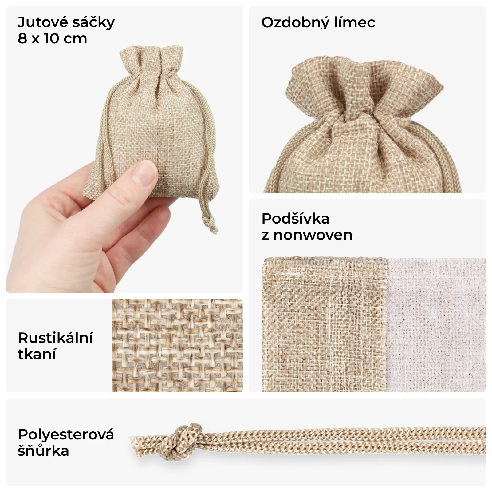 Jutové sáčky 8 x 10 cm v přírodní barvě jsou malé dekorační obaly určené pro drobné předměty, dárky i firemní prezentaci. Tento set obsahuje 10 ks jutových sáčků 8 x 10 cm s dvojitou stahovací šňůrkou a ozdobným lemem nad tunýlkem, který dodává balení čistý a upravený vzhled.