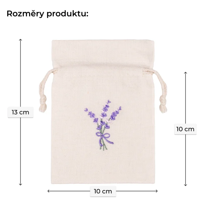 Objevte sadu 10 elegantních pytlíčků o velikosti 10x13 cm, které jsou ušity ze směsi bavlny a polyesteru imitující lněnou tkaninu a ozdobeny jemnou výšivkou levandule. Jsou ideální jako voňavé sáčky do skříně, dekorativní obaly na ručně vyráběná mýdla, svíčky či malé dárky.