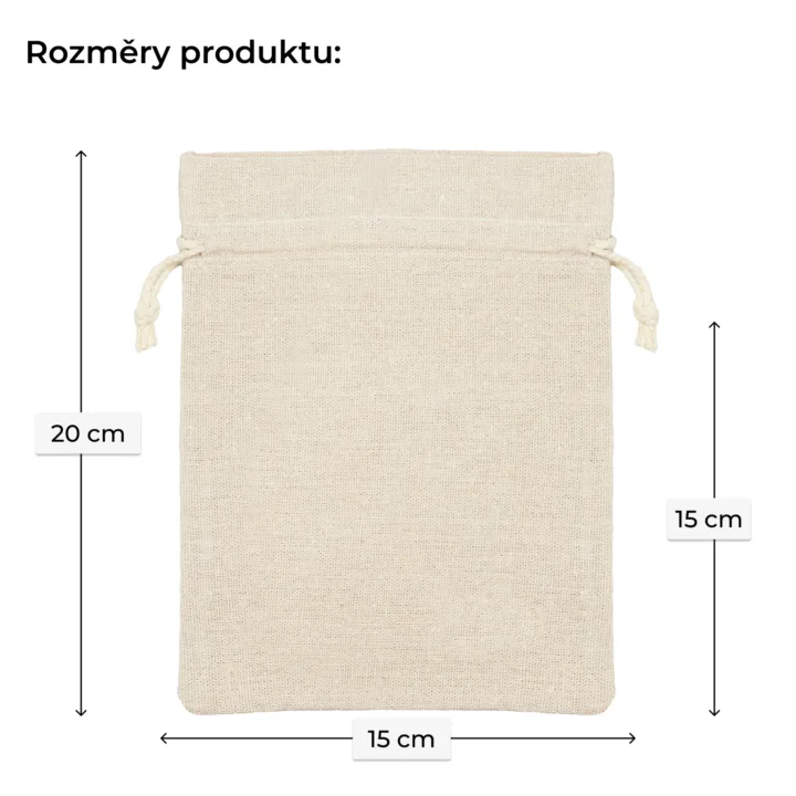 Sáčky mají rozměry 15 cm na šířku a 20 cm na výšku, přičemž výška po stahovací šňůrku je 15 cm.