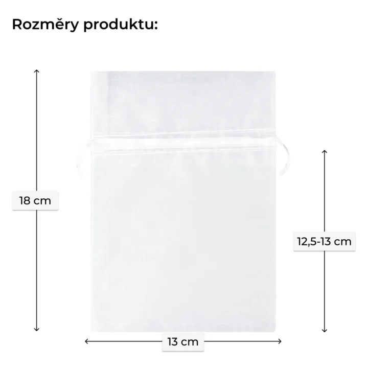 Organza sáčky 13 x 18 cm v bílé barvě jsou univerzální středně velké pytlíčky vhodné na drobné dárky, kosmetické vzorky, šperky i firemní dárkové předměty. V balení najdete 25 ks lehkých, poloprůhledných sáčků se stahovací tunýlkem a dvojitou saténovou stužkou, díky které se snadno otevírají a bezpečně zavírají. Jsou vhodné pro domácí použití i pro firmy hledající elegantní, lehké a reprezentativní balení.
