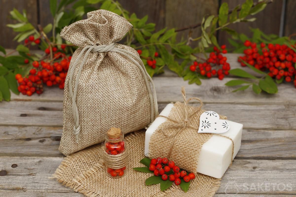 Pokud chcete svým blízkým dát ručně robeny mýdlo, měli byste přemýšlet o vhodném dárkovým sáčku. Dekorativní průsvitné organzové dárkové sáčky jsou skvělé pro balení ručně vyrobeného mýdla. Organza není jediný materiál, ze kterého šijeme naše dárkové sáčky. V nabídce obchodu jsou sáčky ze smyslného saténu, elegantního veluru, stejně jako lesklé metalické sáčky a vždy módní džínsové sáčky. Nabízíme také přírodní lněné a jutové sáčky, ideální pro balení přírodních mýdel.