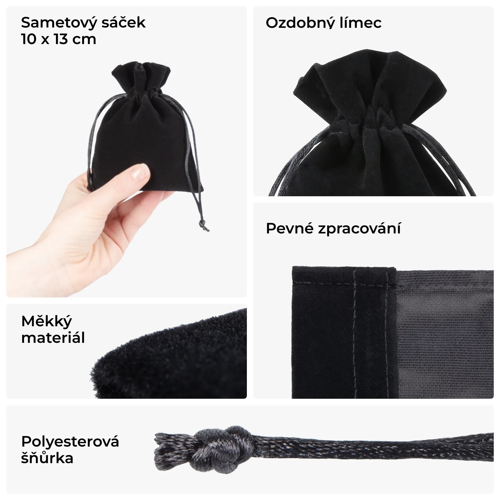 Sáčky spojují elegantní vzhled, měkký materiál a každodenní praktičnost. Černý samet zvýrazní barvu i tvar šperků a dalších malých produktů. Dvojitá stahovací šňůrka zajišťuje pohodlné používání a podporuje opakované využití.